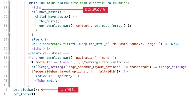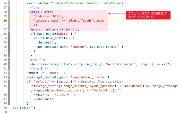 ホームWordpress edgeテーマをカスタマイズ−1(index.php) 2024年10月30日2024年11月8日 SHARE ポスト シェア はてブ LINE インデックスページにはサイドバーがいらないので、get_sidebar();を削除して、新着情報に表示する記事を特定のカテゴリーだけにしたいので、プログラムを追加した。 コメントを残す コメントをキャンセルメールアドレスが公開されることはありません。 ※ が付いている欄は必須項目ですコメント ※ 名前 ※ メール ※ サイト 次回のコメントで使用するためブラウザーに自分の名前、メールアドレス、サイトを保存する。 上に表示された文字を入力してください。 Δ